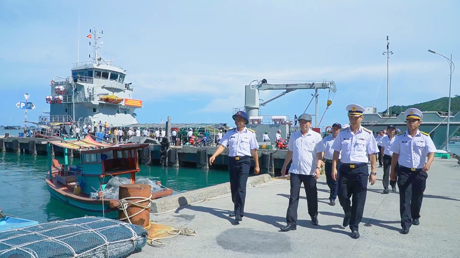 Đoàn công tác di chuyển từ tàu lên đảo Nam Du (quần đảo Nam Du có 21 hòn đảo, trong đó 11 đảo có người dân sinh sống với hơn 4.100 người)
