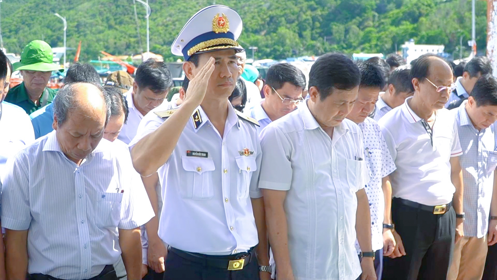 Các đồng chí lãnh đạo tưởng niệm nạn nhân trên đảo (khoảng 460 người) thiệt mạng bởi cơn bão số 5 năm 1997
